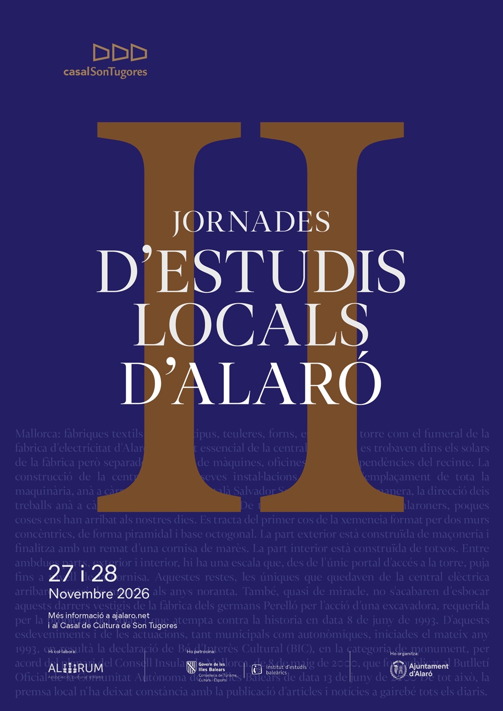 L’Ajuntament d’Alaró ha obert la convocatòria per a la celebració de les II Jornades d’Estudis Locals, que tindran lloc els dies 27 i 28 de novembre d’enguany al Casal de Son Tugores. El termini per inscriure’s i presentar propostes de comunicacions finalitza el 9 d’octubre.